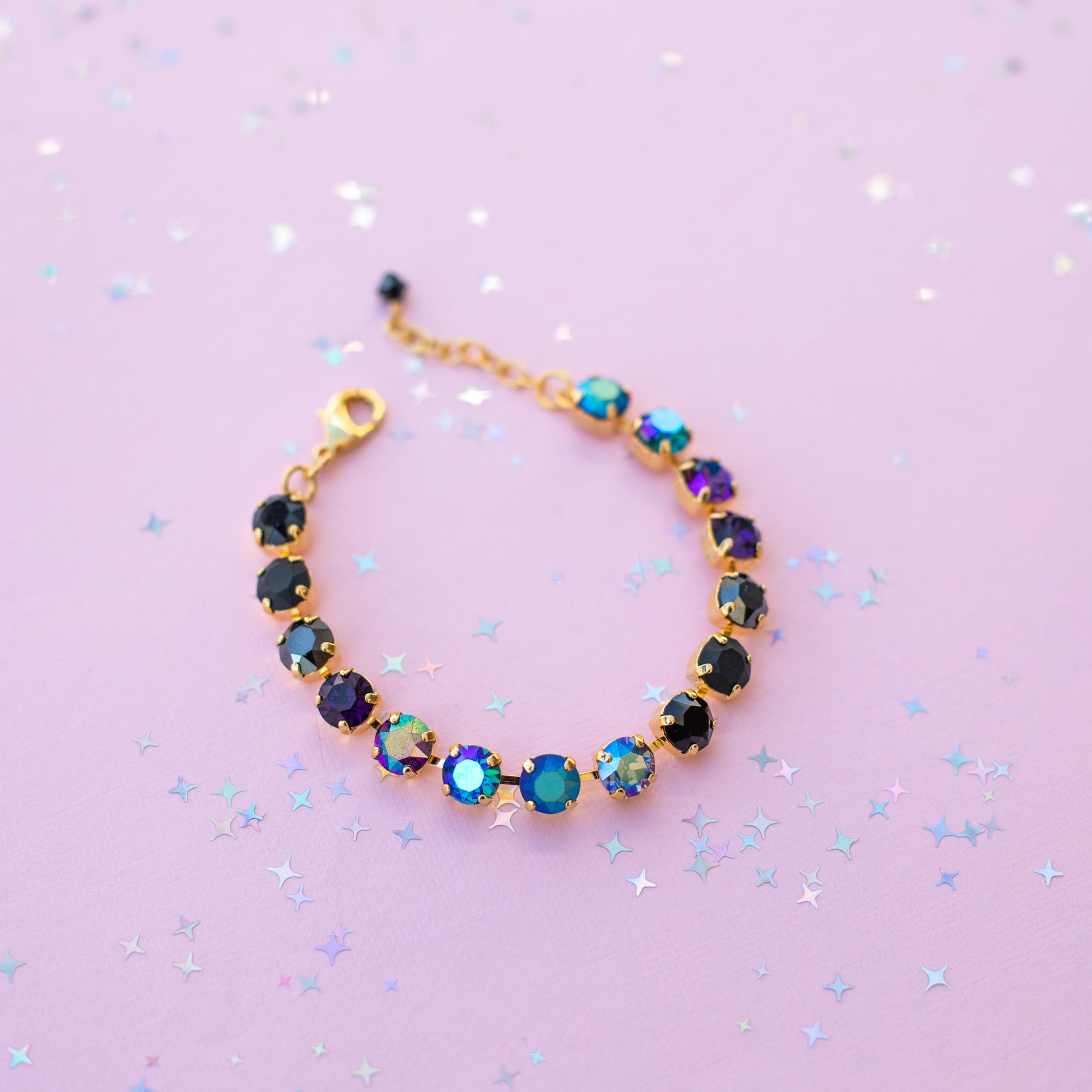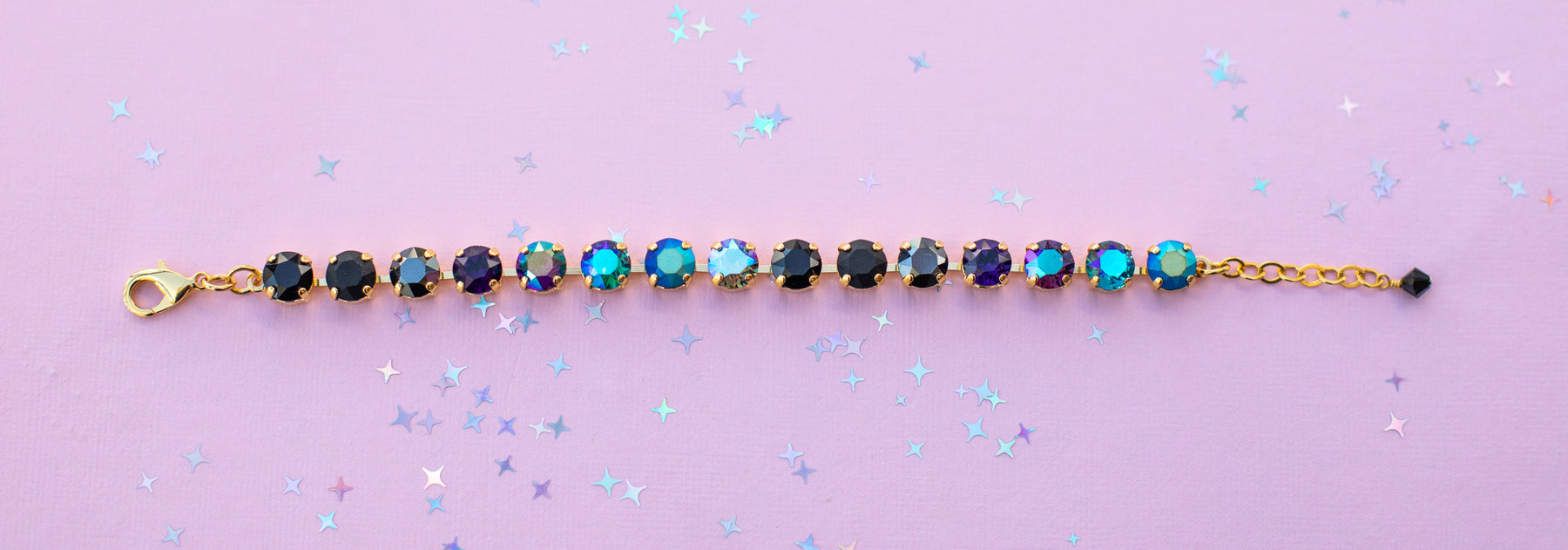 Please avoid using lotions and swimming/showering to extend life. Crystals are glass so please handle with care. Coating on crystals can scratch if rubbed against other hard surfaces over time. Please do not use a soap or water to clean, just a dry polishing cloth.