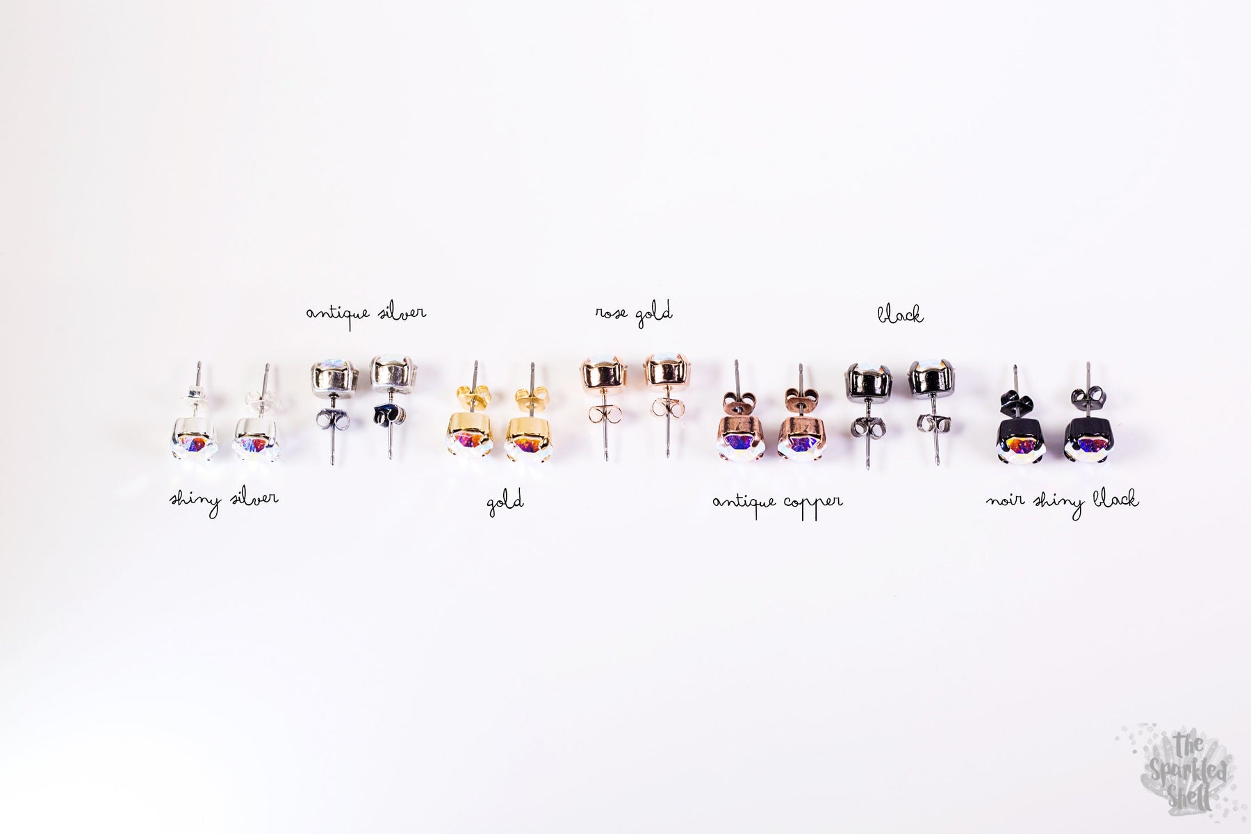 As a reminder this is a plated setting and everyone's skin and body oils and elements they expose to jewelry that's plated can over time wear on the plating and tarnish. Please avoid using lotions and using swimming/showering to extend life. Crystals are glass so please handle with care. Coating on crystals can scratch if rubbed against other hard surfaces over time. Please do not use a soap or water to clean, just a dry polishing cloth. There's small pieces that could be a chocking hazard if swallowed please do not put in mouth or allow children to wear unattended.