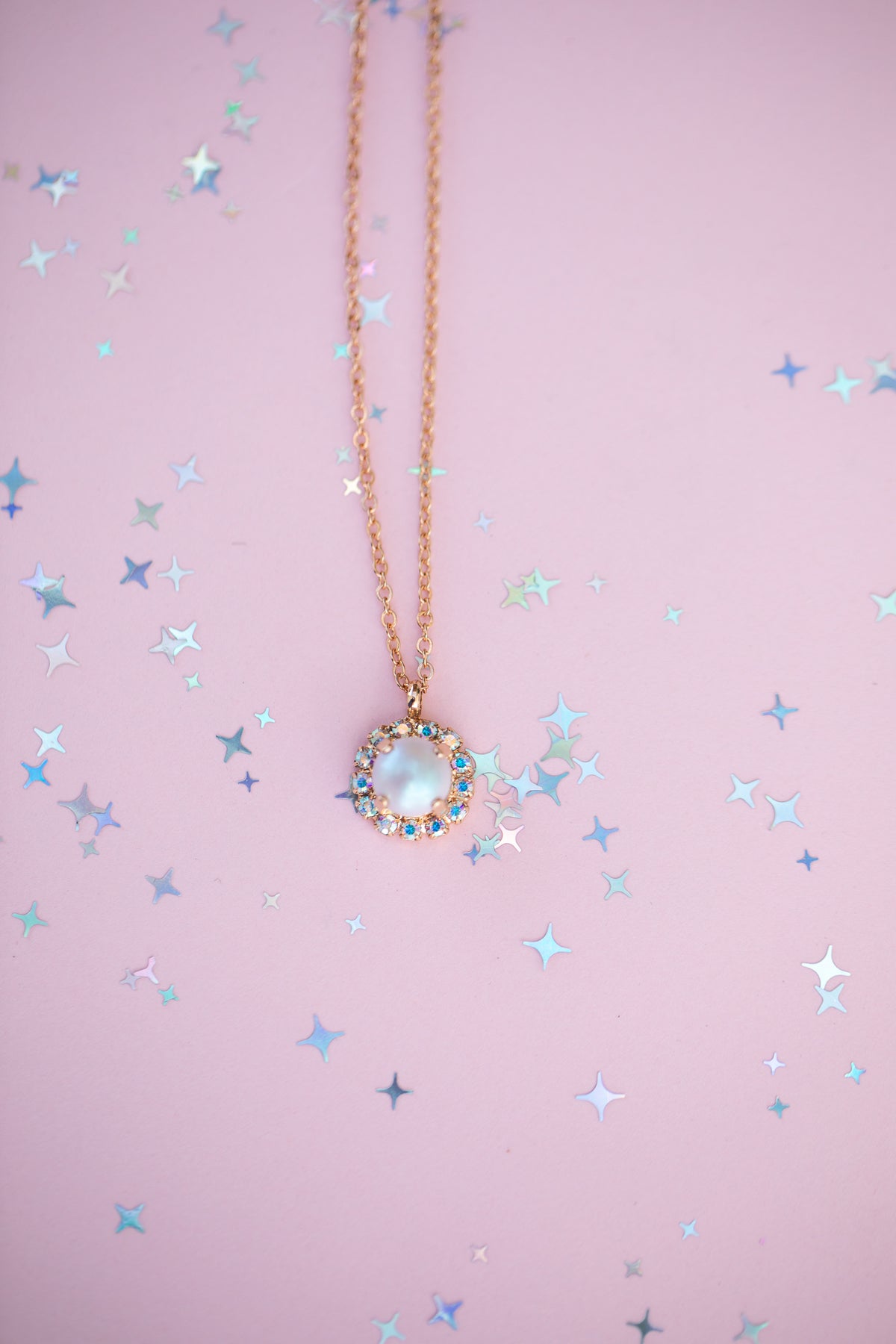 8mm Halo Dreamy Pink Pearl -Rose Gold setting