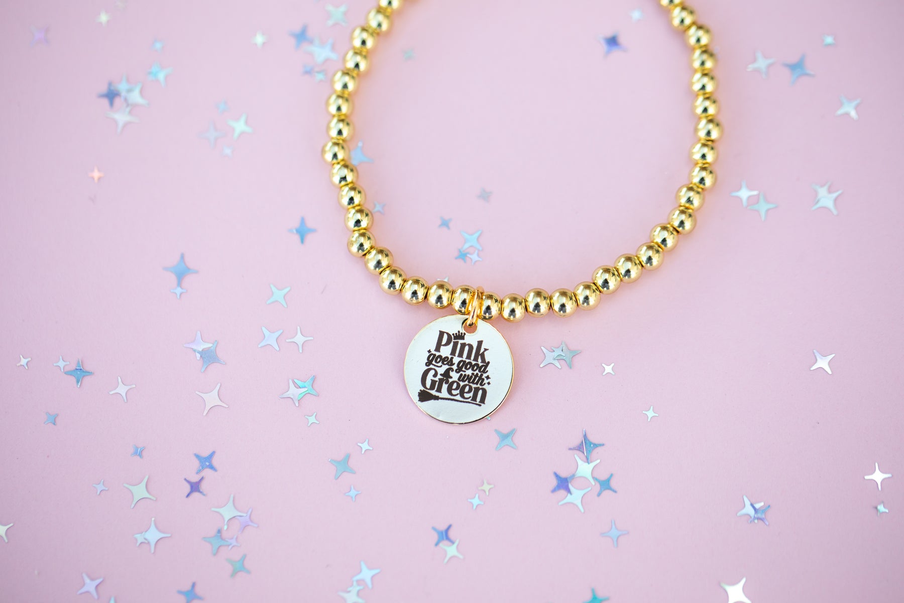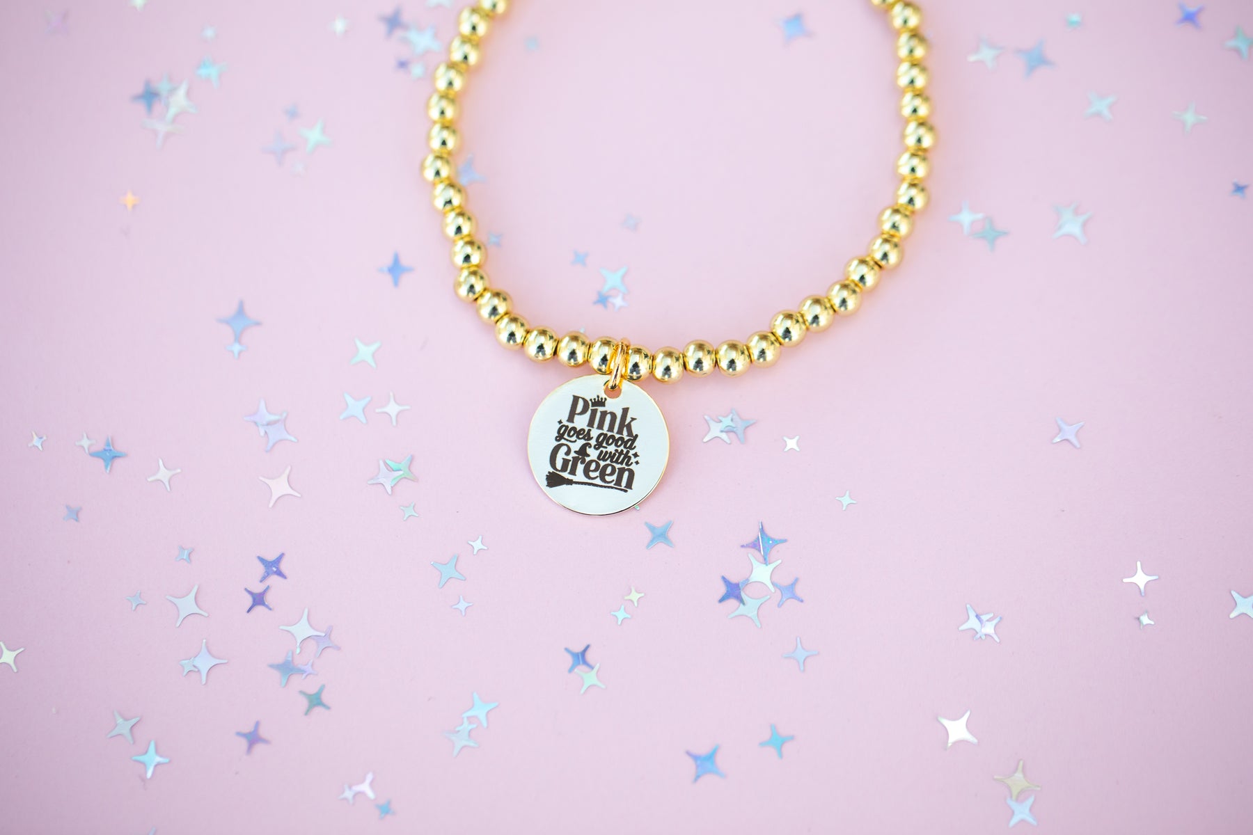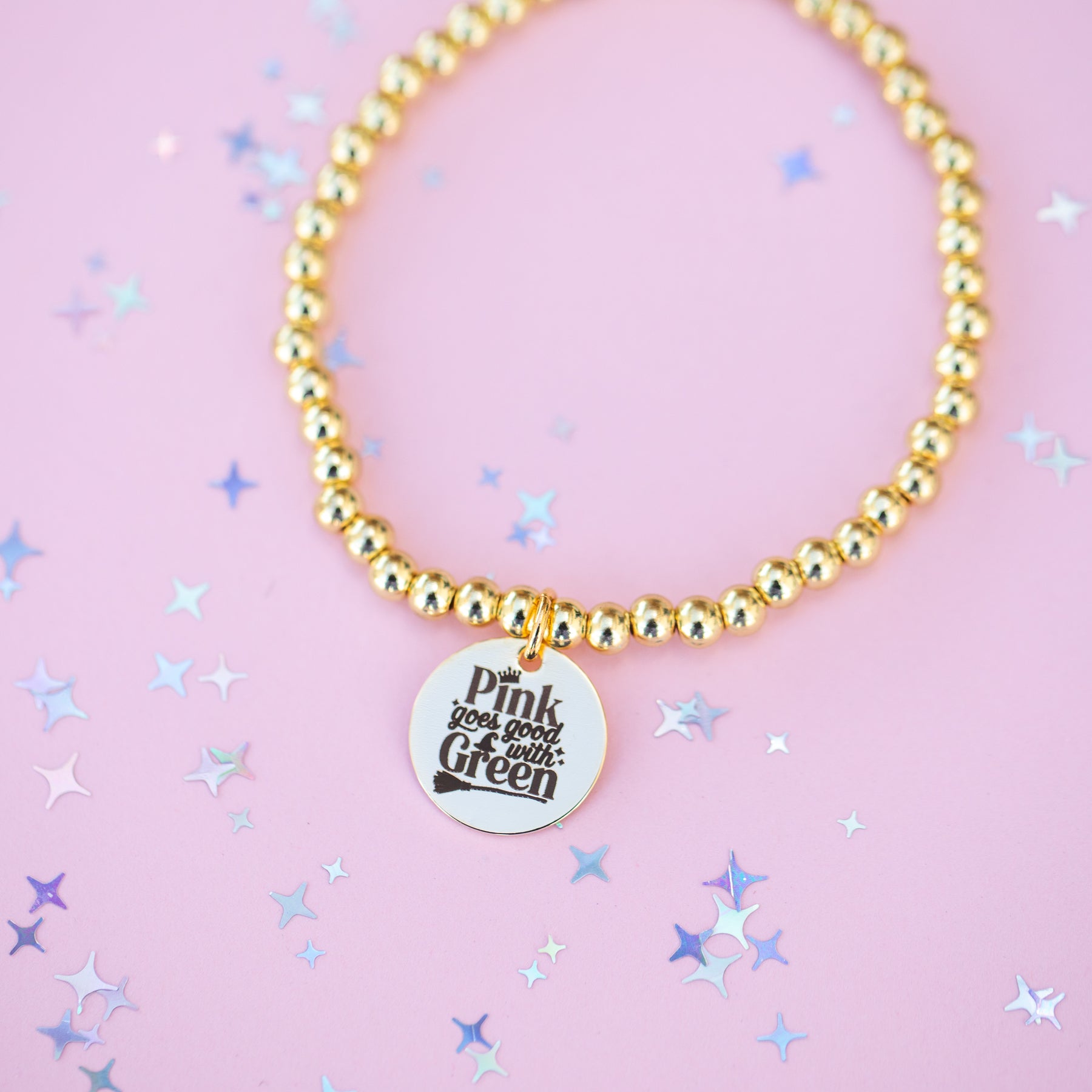 Round Charm Stretch Beaded Bracelet - Choose setting Color (Pink Goes Good with Green)