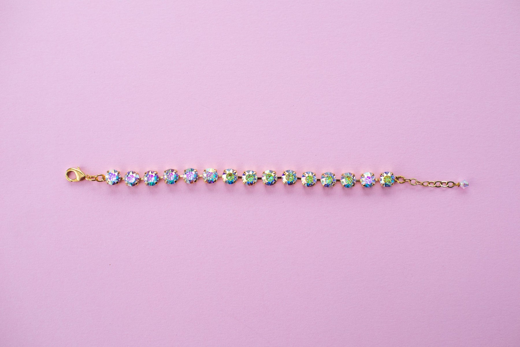 This bracelet made with Crystals is just stunning! It has crystals each in 8mm (5/16"). The bracelet base is Nickel free, lead free brass plated in the shade of Gold. (You may select another color at checkout). The AVERAGE full length of this bracelet is about 7.25 inches long with a 1 inch extender on the end. (This is the size pictured in photos) You can also select the DAINTY wrist length of about 6.25 inches long with a 1 inch extender on end - this listing will be made with 2 crystals missing from the photos above to make it smaller. (PHOTOS SHOWN ARE FOR AVERAGE LENGTH). **I SUGGEST AVERAGE LENGTH FOR MOST UNLESS SOMEONE KNOWS THEIR WRISTS ARE VERY DAINTY**